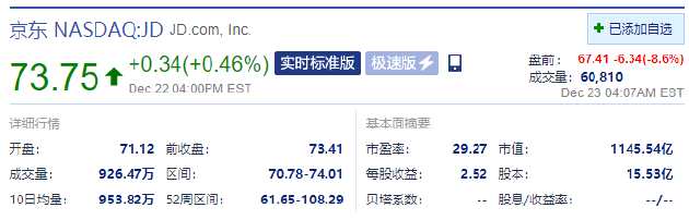 新浪科技訊 北京時(shí)間12月23日下午消息,美股京東盤前跌超8%,截至發(fā)稿,報(bào)每股67.41美元。