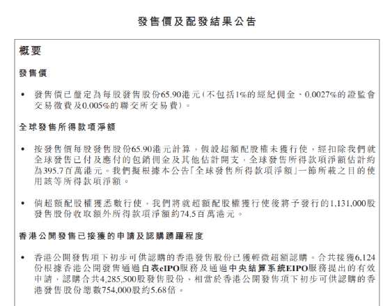 圣諾醫(yī)藥在港交所公告稱(chēng),香港IPO發(fā)售價(jià)已厘定為每股發(fā)售股份65.90港元,全球發(fā)售所得款項(xiàng)凈額估計(jì)約為3.9億港元。香港公開(kāi)發(fā)售項(xiàng)下初步可供認(rèn)購(gòu)的香港發(fā)售股份已獲約5.68倍輕微超額認(rèn)購(gòu)。股份預(yù)期將于2021年12月30日(星期四)上午九時(shí)正(香港時(shí)間)在聯(lián)交所主板開(kāi)始買(mǎi)賣(mài)。股份將以每手50股股份進(jìn)行買(mǎi)賣(mài)。股份的股份代號(hào)為2257,一手中簽率21.77%,乙頭獲配223手,中簽率15.93%。