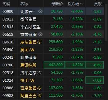 恒生科技指數(shù)跌幅擴大至1.2% 京東、美團、騰訊跌近2%