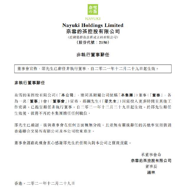 摘要: 查看最新行情新浪科技訊12月29日晚間消息,奈雪的茶發(fā)布公告,稱深創(chuàng)投黨委副書(shū)記邵鋼已辭任非執(zhí)行董事,自2021年12月29日起生效。深創(chuàng)投為奈雪的茶主要投資方之一。