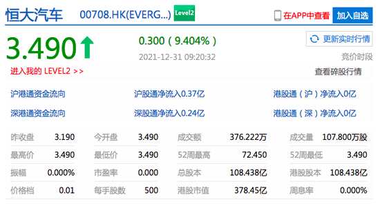 摘要: 查看最新行情新浪科技訊12月31日上午消息,港股恒大汽車開漲超9%,恒大汽車第一款量產(chǎn)車型恒馳5首車于12月30日提前下線。