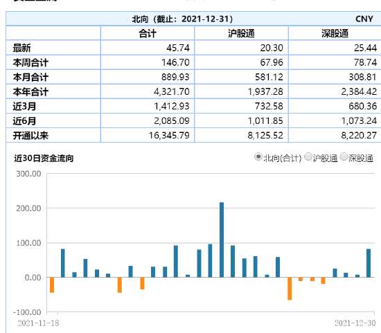 12月31日消息,北向資金實(shí)際凈買(mǎi)入45.74億元,12月累計(jì)凈買(mǎi)入近890億元,月凈買(mǎi)入額創(chuàng)歷史新高。2021年北向加速流入,共計(jì)加倉(cāng)A股超4321.7億元,同步刷新歷史紀(jì)錄。今日滬股通凈買(mǎi)入20.3億元,深股通凈買(mǎi)入25.43億元。