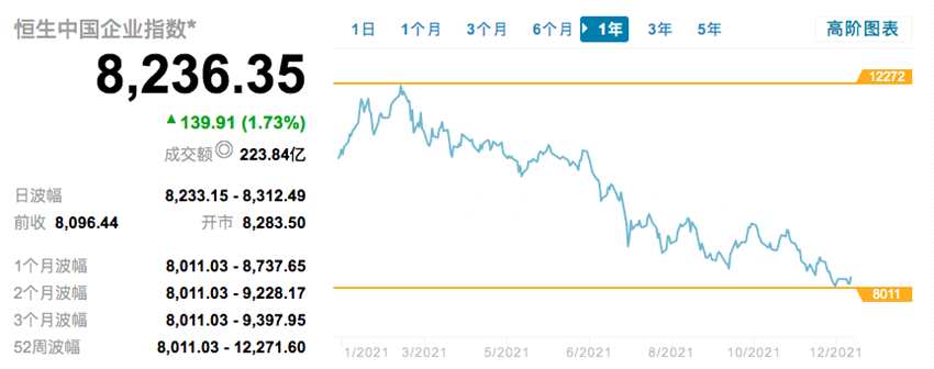 恒生中國企業(yè)指數(shù)全年回報為-23.3%,最高見12272點,最低見8011點,收報8236.35點。而國指2020年年回報為-3.8%。