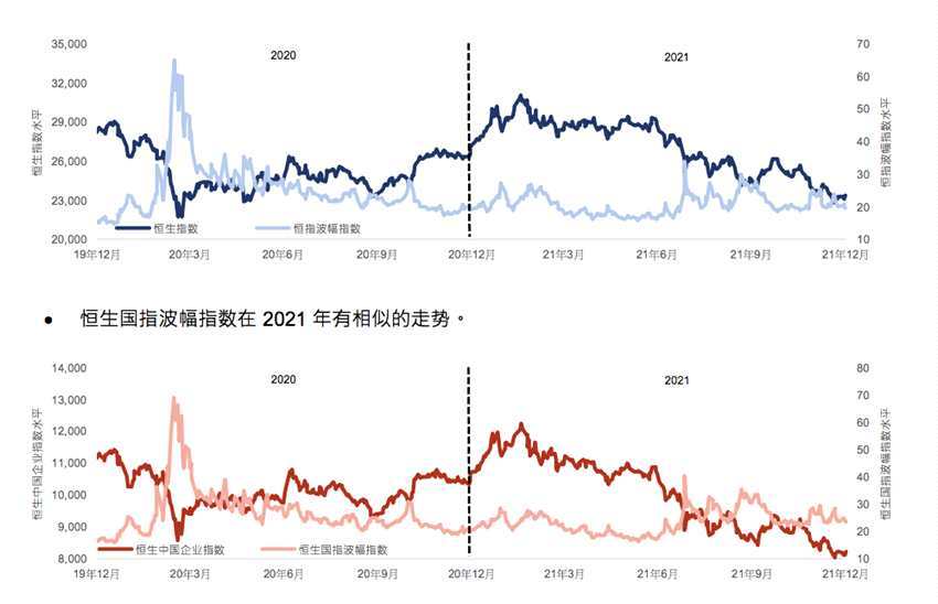 盡管2021年恒指頂點及谷底之間的波幅為8340點,國指頂點及谷底之間的波幅為4186點,均高于2020年的波幅。2020年恒指波幅為7360點,國指為2860點。但度量恒指和國指30個日歷預期波幅的恒指波幅指數(shù)和恒生國指波幅指數(shù),顯示出2021年市場?險減低。