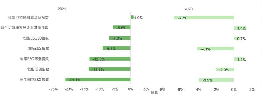 恒指ESG指數(shù)及恒生國指ESG指數(shù),在根據(jù)可持續(xù)發(fā)展評分對恒指和國指成份股進行權(quán)重調(diào)整后,與恒指和國指相比,表現(xiàn)更佳。恒生ESG50指數(shù)表現(xiàn)分別跑贏恒指ESG指數(shù)及恒生國指ESG指數(shù)2.1及14.2個百分點。