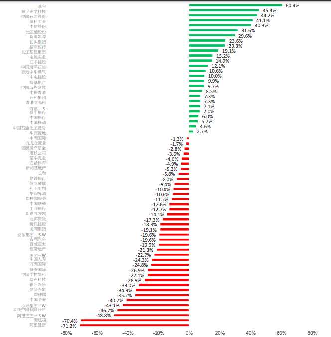 64只恒生指數(shù)成份股當中,26只在本年度上升,上漲率40.6%。李寧、舜宇光學科技和中國石油股份表現(xiàn)最好,今年分別上漲60.4%、45.4%和44.2%。阿里健康、海底撈全年累跌71.2%與70.4%,阿里巴巴全年累跌逾48.8%,成為表現(xiàn)最差的3只成分股。