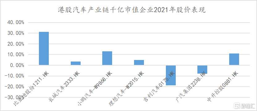 若進一步放眼港股汽車產(chǎn)業(yè)鏈千億市值陣營,分化其實也有進一步體現(xiàn)(如下圖)。