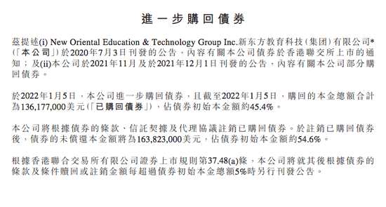 摘要: 查看最新行情新浪科技訊1月5日晚間消息,新東方今日在港交所發(fā)布公告稱,公司進一步購回債券,且截至2022年1月5日,購回的本金總額合計為136,177,000美元,占債券初始本金額約45.4%。