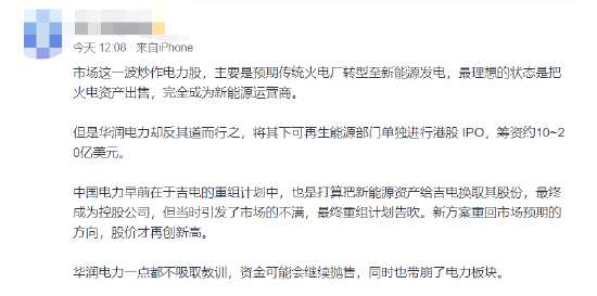 股民紛紛對華潤電力分拆再生能源業(yè)務(wù)上市看空,有業(yè)內(nèi)人士認(rèn)為,“市場這一波炒作電力股,主要是預(yù)期傳統(tǒng)火電廠轉(zhuǎn)型至新能源發(fā)電,最理想的狀態(tài)是把火電資產(chǎn)出售,完全成為新能源運營商。但是華潤電力卻反其道而行之,將其下可再生能源部門單獨進(jìn)行港股IPO,籌資約10~20億美元?!?/p>
