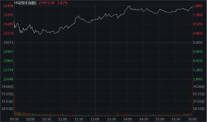 截至收盤,恒生指數(shù)漲1.82%,報(bào)23493.38點(diǎn);恒生國(guó)企指數(shù)漲2.01%,報(bào)8231.28點(diǎn);恒生科技指數(shù)漲1.99%,報(bào)5503.91點(diǎn)。
