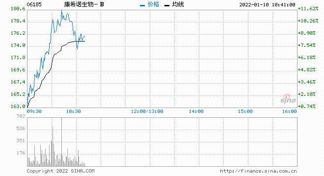 1月10日消息,康希諾生物漲10.01%,報(bào)178港元,最新市值440.46億港元。
