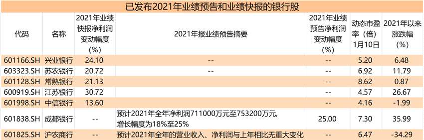 根據(jù)財華社統(tǒng)計,截至目前,A股已有5家公司(興業(yè)銀行、蘇農(nóng)銀行、常熟銀行、江蘇銀行和中信銀行)發(fā)布了2021年度業(yè)績快報,另外有2家公司(成都銀行601838.SH、【滬農(nóng)商行(601825)、股吧】601825.SH)發(fā)布了2021年度業(yè)績預(yù)告公告。