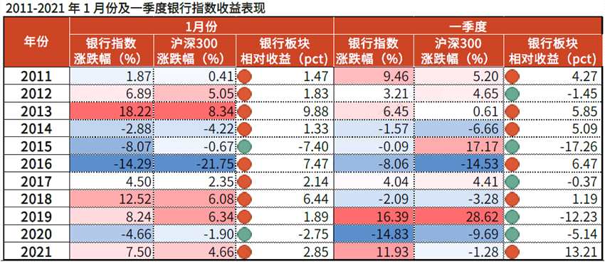 光大證券復盤2011-2021年銀行板塊表現(xiàn)發(fā)現(xiàn),多數(shù)年份,1Q銀行板塊走勢較好;特別是1月份,銀行板塊錄得相對收益的勝率更高。
