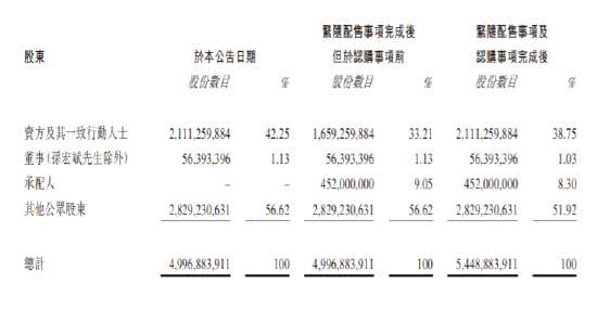 配售股份及認(rèn)購(gòu)股份分別占本公司現(xiàn)有已發(fā)行股本的約9.05%,及經(jīng)認(rèn)購(gòu)事項(xiàng)擴(kuò)大后本公司已發(fā)行股本的約8.30%。認(rèn)購(gòu)事項(xiàng)所得款項(xiàng)總額為45.20億港 元,折合約5.80億美元。配售價(jià)較昨日收市價(jià)大幅折讓15.3%,公司先舊后新配售,認(rèn)購(gòu)?fù)瓿珊螅瑢O宏斌持股將稀釋為38.75%。