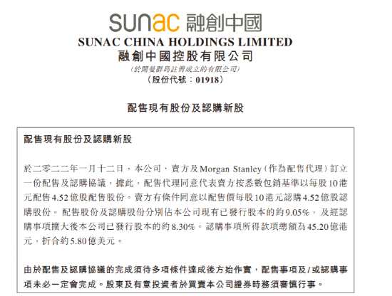 融創(chuàng)中國(guó):大股東大幅折讓15%先舊后新配售4.52億股 籌資45.2億港元
