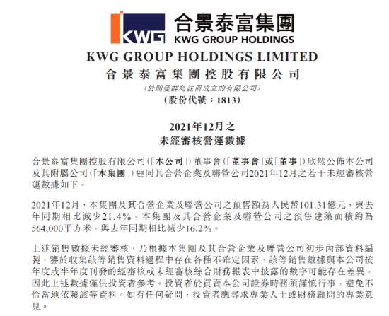 合景泰富集團(tuán):2021年12月預(yù)售額為101.31億元,同比減少21.4%