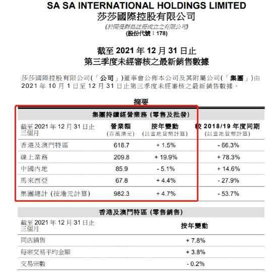 莎莎國際2021年第四季度實現(xiàn)營業(yè)額9.82億港元,同比增加4.7%