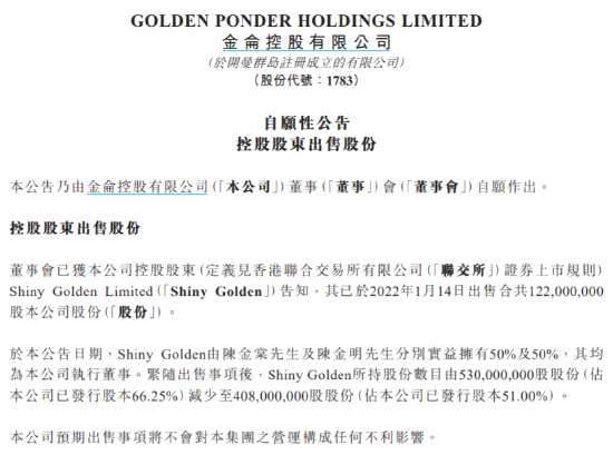 摘要: 金侖控股(01783)公布,已獲控股股東ShinyGolden告知,他已于上周五(14日)出售合共1.22億股,或約15.25%股權(quán)。該集團(tuán)指,于本公告日期,「ShinyGolden由兩名執(zhí)行董事陳金