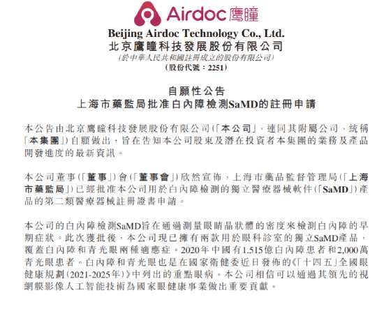 鷹瞳科技-B:上海市藥監(jiān)局批準(zhǔn)白內(nèi)障檢測(cè)SaMD的注冊(cè)申請(qǐng)