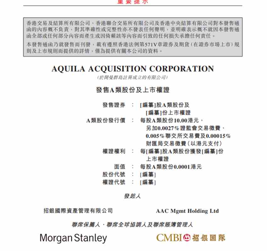 (上海,編輯 胡家榮)隨著香港SPAC上市機(jī)制正式落地,港股市場(chǎng)迎來(lái)首個(gè)SPAC公司。Aquila Acquisition Corporation周一晚間向港交所遞表,其發(fā)起人為招銀國(guó)際資產(chǎn)有限公司、AAC Mgmt Holding Ltd,聯(lián)席保薦人、聯(lián)席全球協(xié)調(diào)人及聯(lián)席賬簿管理人為摩根士坦利和招銀國(guó)際。