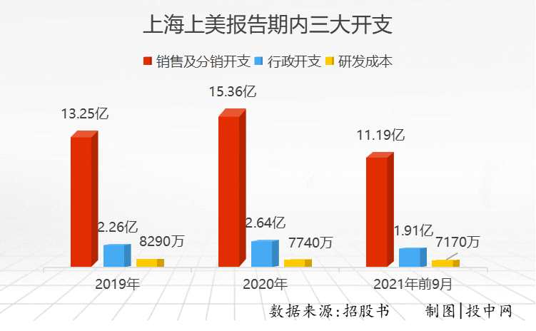 上美的營銷費用不菲。2019年、2020年及2021年前三季度,銷售及分銷開支分別為13.25億元、15.36億元及11.19億元,分別占公司總營收的46.1%、45.4%和43.1%。