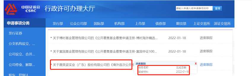 摘要: 1月19日訊了解到,1月18日,證監(jiān)會公布薇美姿實(shí)業(yè)(廣東)股份有限公司(下稱“薇美姿”)的《境外首次公開發(fā)行股份(包括普通股、優(yōu)先股等各類股票及股票的派生形式)審批》進(jìn)度,目前進(jìn)度已達(dá)接收材料階段。