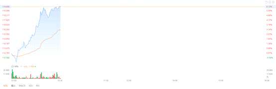 周四早盤,安踏體育的走勢表現(xiàn)也不負(fù)眾望,平開高走,現(xiàn)在漲6.74%,報120港元。