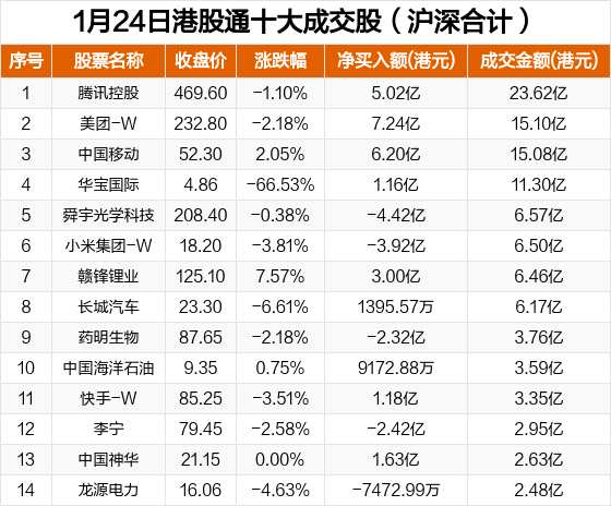 1月24日港股通十大成交股(附名單)