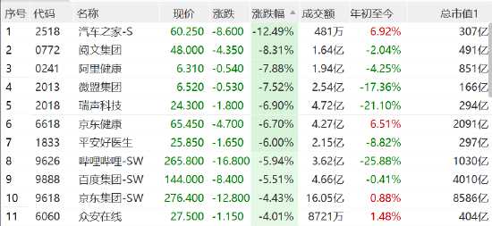 汽車之家跌超12%,閱文集團(tuán)跌超8%,阿里健康跌近8%,京東健康、瑞聲科技、微盟等跌超6%,百度、京東、B站等跌超5%。