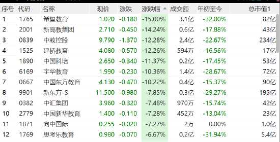 教育股遭遇重挫,希望教育跌15%,新高教集團(tuán)跌14%,中教控股、建橋教育跌超12%,宇華教育、中國東方教育跌超10%。