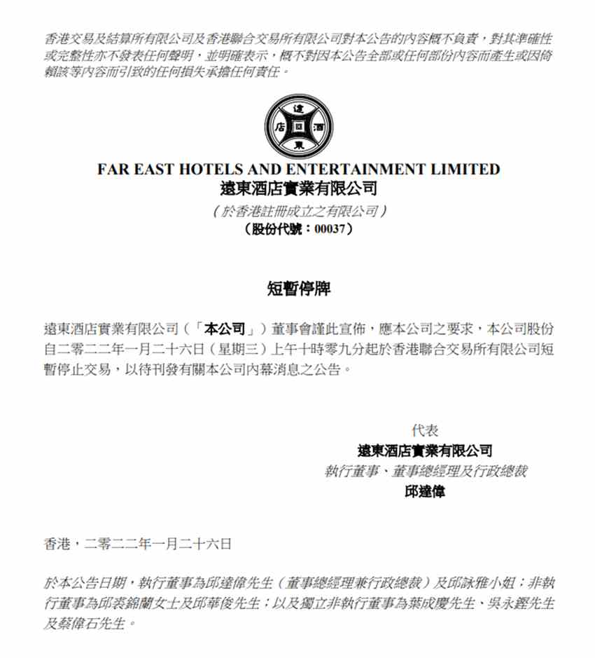 根據(jù)遠(yuǎn)東酒店早盤公告,該公司自2022?1月26日(星期三)上午十時(shí)零九分起于香港聯(lián)合交易所有限公司短暫停止交易,以待刊發(fā)有關(guān)本公司內(nèi)幕消息之公告。