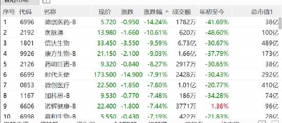 醫(yī)藥股領(lǐng)跌居前,德琪醫(yī)藥跌14%,醫(yī)脈通跌超10%,信達(dá)生物跌10%,康方生物跌超9%,藥明巨諾跌超8%。