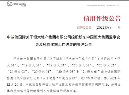 中誠信國際:恒大集團(tuán)風(fēng)險化解工作復(fù)雜程度較高 將持續(xù)關(guān)注