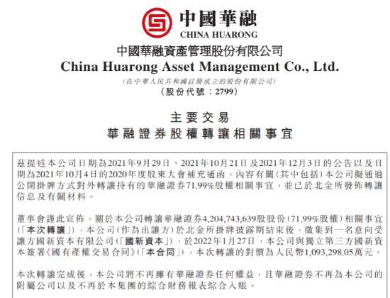 中國華融1月27日晚間在港交所公告稱,與獨立第三方國新資本簽署《國有產(chǎn)權交易合同》,向其轉讓華融證券71.99%股權,作價109.33億元,轉讓完成后,將不再擁有華融證券任何權益。