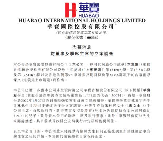 華寶國際在港交所公告,公司非全資附屬公司華寶股份(300741)于2022年1月27日收到衡陽縣監(jiān)察委員會立案通知書,華寶國際執(zhí)行董事兼聯(lián)席主席林嘉宇先生現(xiàn)因涉嫌違法接受立案調(diào)查,林嘉宇為華寶股份實際控制人朱林瑤之子