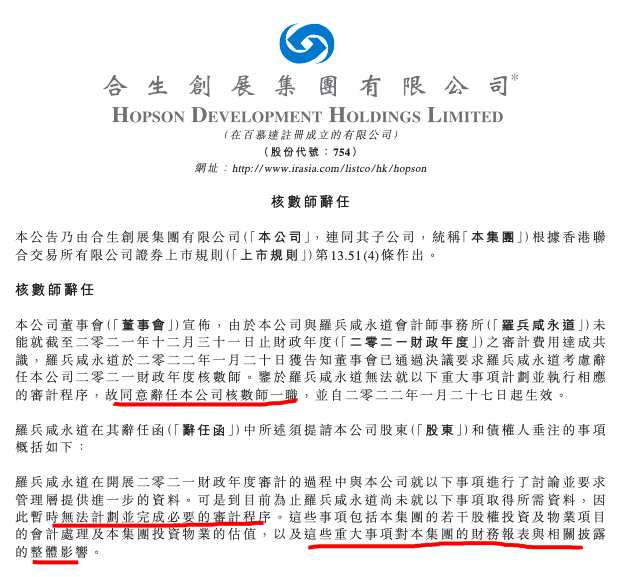 摘要: 1月28日訊:合生創(chuàng)展集團有限公司(簡稱:合生創(chuàng)展集團,0754.HK)發(fā)布核數(shù)師辭任的公告稱,由于公司與羅兵咸永道會計師事務(wù)所未能就截至2021年12月31日止財政年度的審計費用達成共識,