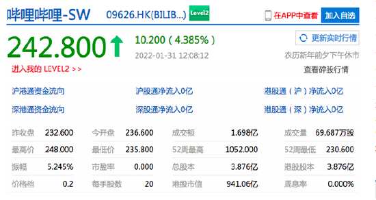 新浪科技訊 1月31日上午消息,香港恒生指數收漲1.07%,恒生科技指數收漲2.35%,港股快手收漲超6%,京東港股、美團收漲超5%,嗶哩嗶哩港股收漲超4%。
