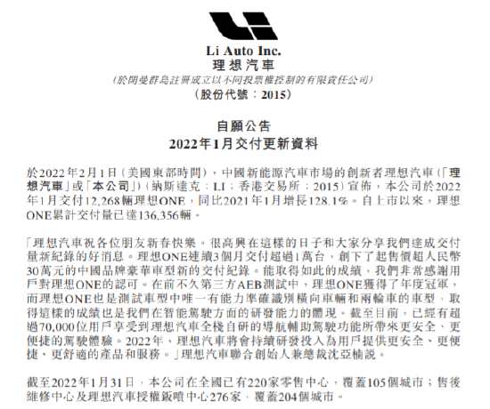 2月4日消息,理想汽車-W(02015)公布,公司于2022年1月交付12268輛理想ONE,同比2021年1月增長128.1%。自上市以來,理想ONE累計交付量已達13.64萬輛。