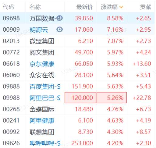 2月4日消息,恒生科技指數(shù)漲幅擴(kuò)大至3%,成分股中,萬國數(shù)據(jù)漲8.58%,微盟集團(tuán)漲7.07%,京東健康漲近6%,百度漲5.63%,阿里漲超5%,嗶哩嗶哩漲超4%。