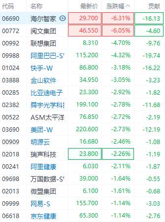 快訊:恒生科技指數(shù)跌幅擴大至2% 海爾智家、閱文集團跌超6%