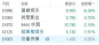 因春節(jié)票房不及預(yù)期,電影板塊跌幅居前,其中,貓眼娛樂(01896.HK)和阿里影視(01060.HK)跌幅居前,分別下跌6.28%和3.7%。