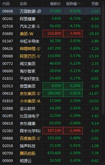 恒生科技指數(shù)跌幅擴(kuò)大至2% 萬國數(shù)據(jù)、阿里健康跌近7%