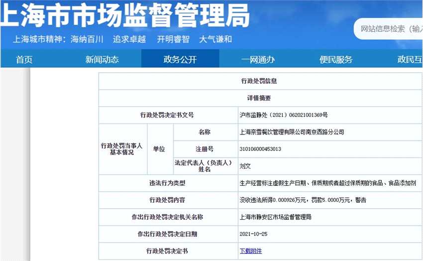 去年10月“奈雪的茶”因出售過期食品被警告、罰款 上海市市場監(jiān)督管理局網(wǎng)站