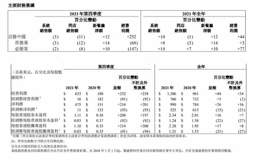 百勝中國(guó)2021主要財(cái)務(wù)業(yè)績(jī)數(shù)據(jù)