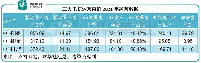 匯總?cè)箅娦胚\(yùn)營(yíng)商的2021年經(jīng)營(yíng)數(shù)據(jù)可得:中移動(dòng)在移動(dòng)業(yè)務(wù)市場(chǎng)仍占據(jù)難以逾越的優(yōu)勢(shì),移動(dòng)業(yè)務(wù)客戶總數(shù)達(dá)到9.57億,是中國(guó)電信全年3.72億的2.57倍,是中國(guó)聯(lián)通(香港)(00762.HK)約3.17億的3倍。