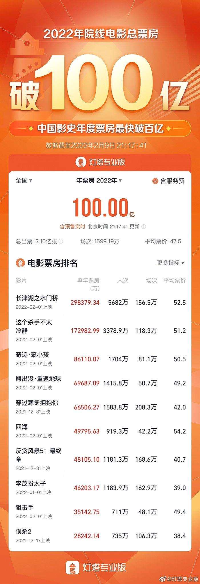 摘要: 據燈塔專業(yè)版數據,截至2月9日晚21時17分,2022年全國院線電影總票房(含預售)正式突破100億元大關,用時40天,刷新中國影史年度票房最快破百億紀錄。