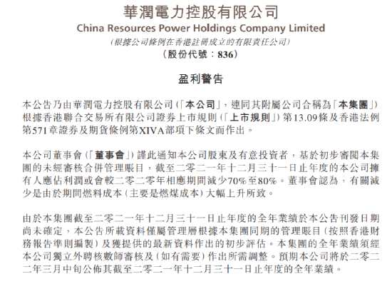 華潤(rùn)電力:2021年公司擁有人應(yīng)占利潤(rùn)較2020年減少70%-80%