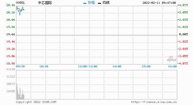 2月11日消息,中芯國際漲2.75%,報20.20港元,最新市值1596.59億港元。