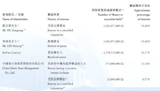 創(chuàng)建于1998年的正榮集團(tuán),業(yè)務(wù)主要分為“正榮地產(chǎn)、正榮資本、正榮服務(wù)”三個(gè)板塊,實(shí)控人為歐宗榮,但已經(jīng)不在正榮服務(wù)、正榮地產(chǎn)擔(dān)任職務(wù)。其中,歐宗榮持股正榮地產(chǎn)54.6%,中國(guó)東方資產(chǎn)持有抵押權(quán)13.16%,三子歐國(guó)偉為非執(zhí)行董事。