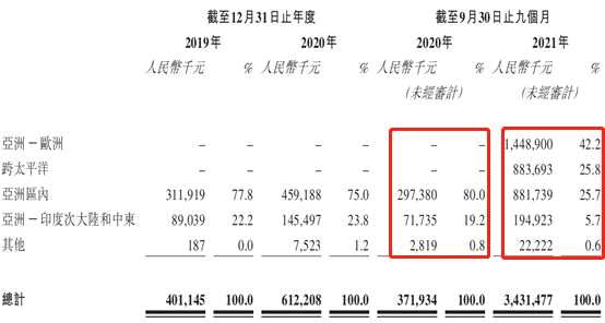 2020年前九個月中聯(lián)航運收入主要來自于亞洲區(qū)內(nèi),占比高達80%。而到了2021前九個月,亞洲—歐洲、跨太平洋、亞洲區(qū)內(nèi)、亞洲—印度和中東占收入的比例分別為42.2%、25.8%、25.7%和5.7%。